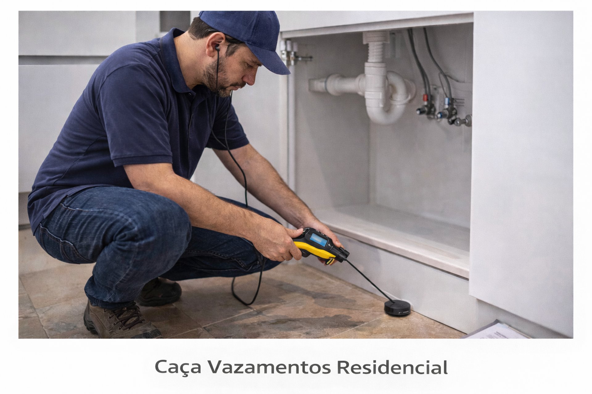 Avaliamos sinais como infiltração, umidade, queda de pressão, ruídos na tubulação e aumento de consumo. Também verificamos pontos críticos (registros, prumadas, casa de máquinas, reservatórios e áreas de passagem).